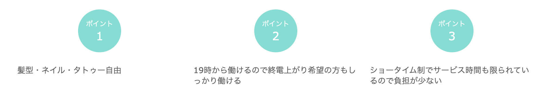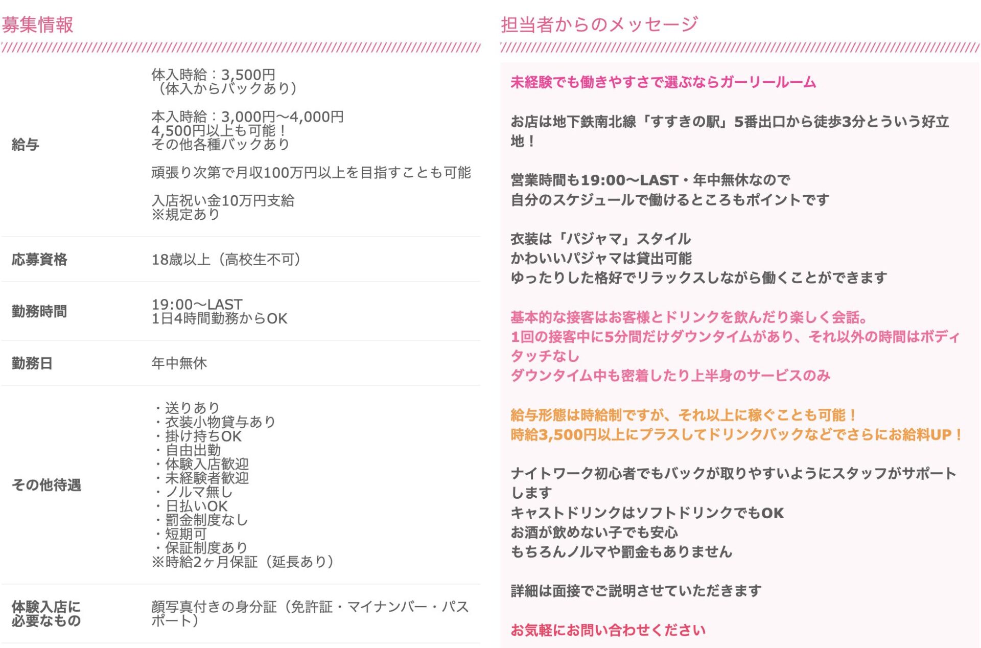 応募資格 | 18歳~35歳(高校生不可) ◆未経験の方も全然OK ◆経験者の方は優遇あり ◆学生・OL・フリーター・Wワークの方歓迎 ◆お酒が飲めなくてもOK ◆お友達同士のご応募も大歓迎 |