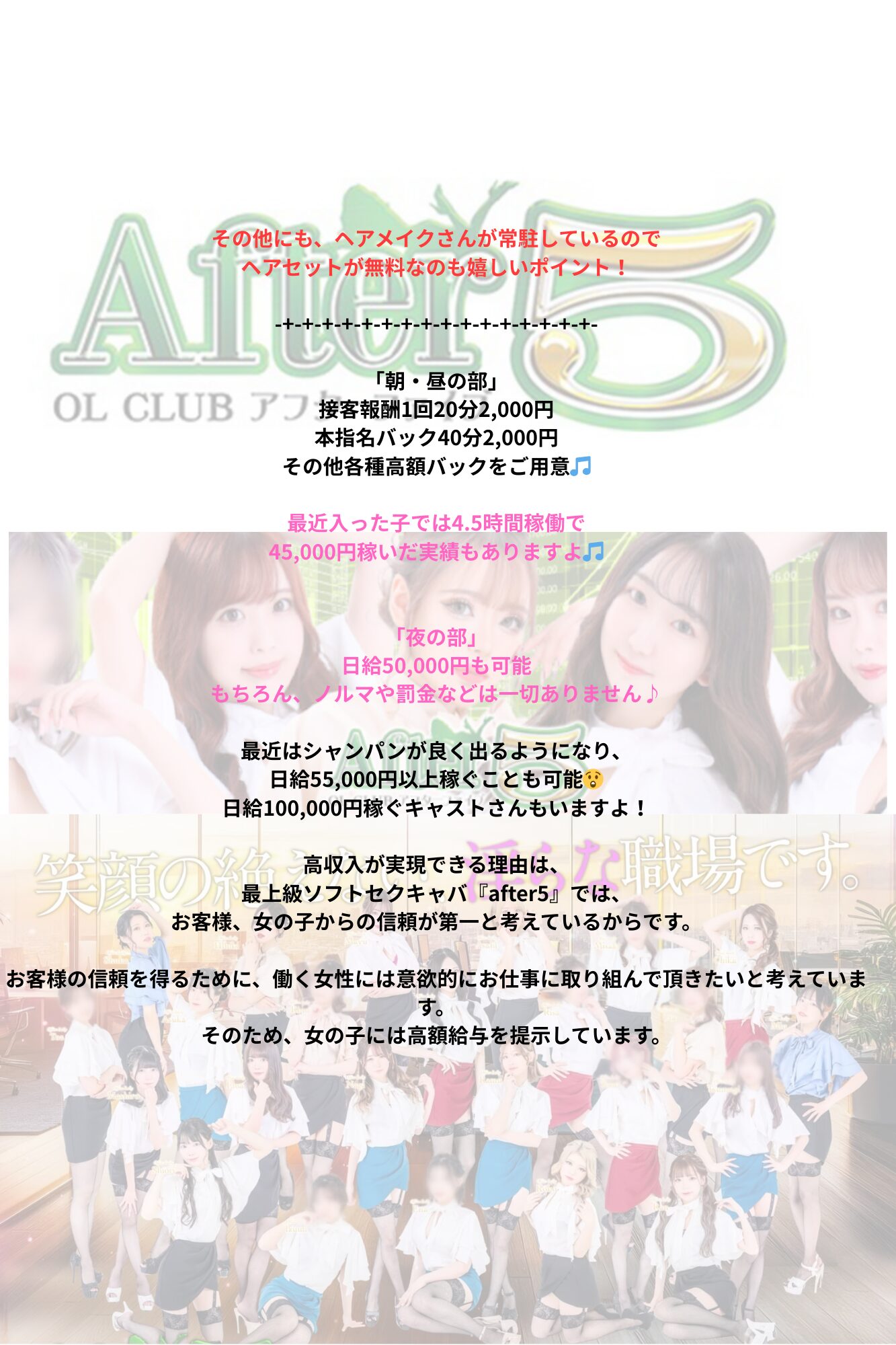 はじめまして!アフター5ではでは、働く女の子の「居心地の良さ」「稼ぎやすさ」を一番に考えています。