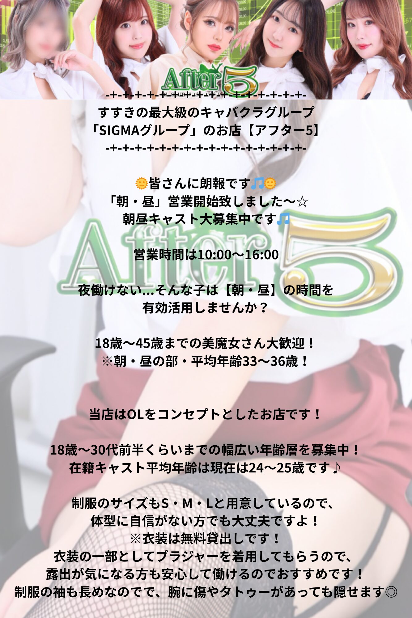 OLコンセプトの衣装になります。お腹なども隠れて着痩せする衣装となってます♪はい!昼夜営業してるので、お好みのライフスタイルで働けます♪